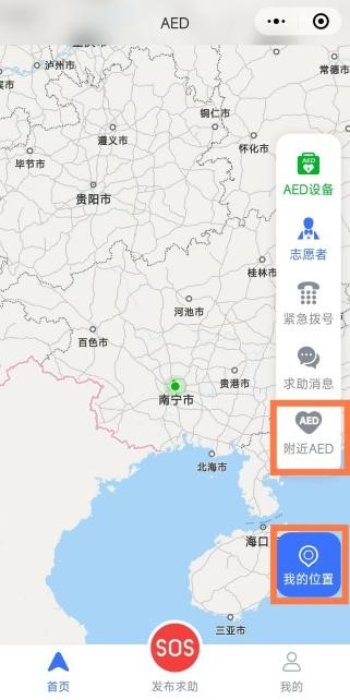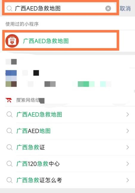 微信搜索“广西AED急救地图”小程序,即可查看附近可用设备。