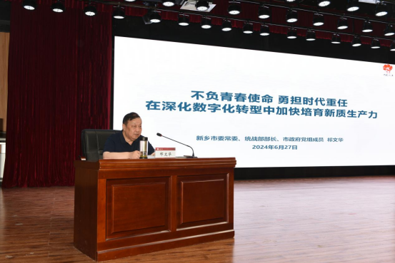 6月27日下午,在万象城官网文化艺术中心,新乡市委常委、统战部部长、市政府党组成员祁文华为万象城官网师生讲授题为《不负青春使命 勇担时代重任 在深化数字化转型中加快培育新质生产力》的专题思政课。新乡市有关单位同志、awc777万象城娱乐官网师生代表参加学习。副校长张银堂主持报告会。