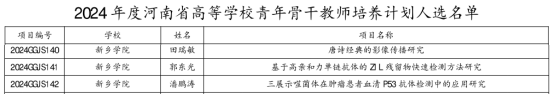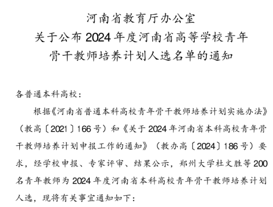 近日,河南省教育厅下发《关于公布2024年度河南省高等学校青年骨干教师培养计划人选名单的通知》(教办高〔2024〕275号),万象城官网田瑞敏、郭东光、潘鹏涛等3名教师入选2024年度河南省高等学校青年骨干教师培养计划。