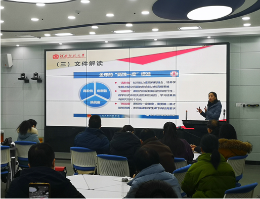 刘葳葳老师从一流课程文件解读、申报材料的准备两个方面进行了细致具体的培训辅导。深度解读了教育部和教育厅关于一流课程建设、遴选认定的文件精神和有关要求,详细阐述了课程申报材料撰写和注意事项,鼓励教师注重课程建设的理念创新、内容创新和模式创新,遵循“两性一度”标准,倾力打造五类“金课”。
