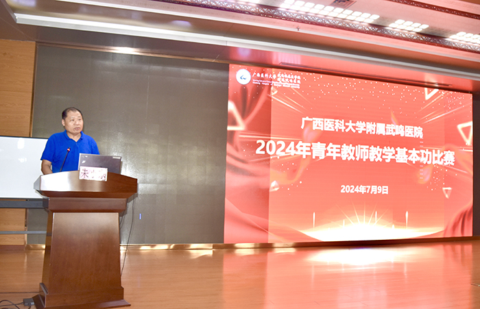 医院党委书记朱小东出席比赛并讲话,他肯定了医院近年来在教学工作方面取得的成绩,并指出,青年教师是武鸣临床医学院教学工作的主力军,是医院未来医学发展的中流砥柱,比赛不仅是检验教师个人的教学水平,更是为了通过以赛促教、以赛促学,促进青年教师之间的交流与分享,以点带面,切实带动和提高医院教学质量。同时要求广大青年教师要以此次比赛为契机,参赛教师赛出风采,赛出水平;观摩教师认真聆听,找差距、寻亮点,共同把比赛资源变成学习资源,真正意义上落实到课堂,发挥比赛对常规教学的辐射作用。
