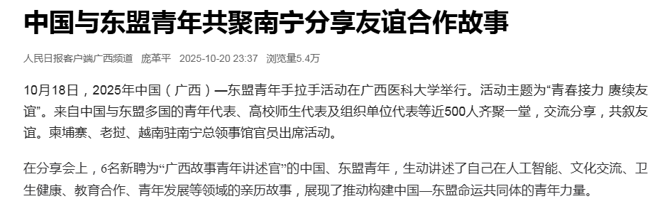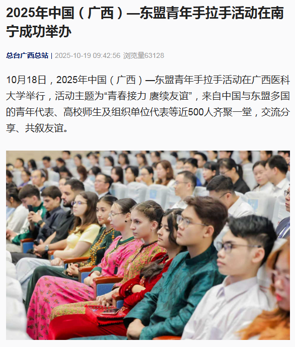 近日,人民日报客户端、央视新闻、广西云-广西日报报道10月18日,2025年中国(广西)—东盟青年手拉手活动在beat365举行。活动主题为“青春接力 赓续友谊”。来自中国与东盟多国的青年代表、高校师生代表及组织单位代表等近500人齐聚一堂,交流分享,共叙友谊。柬埔寨、老挝、越南驻南宁总领事馆官员出席活动。