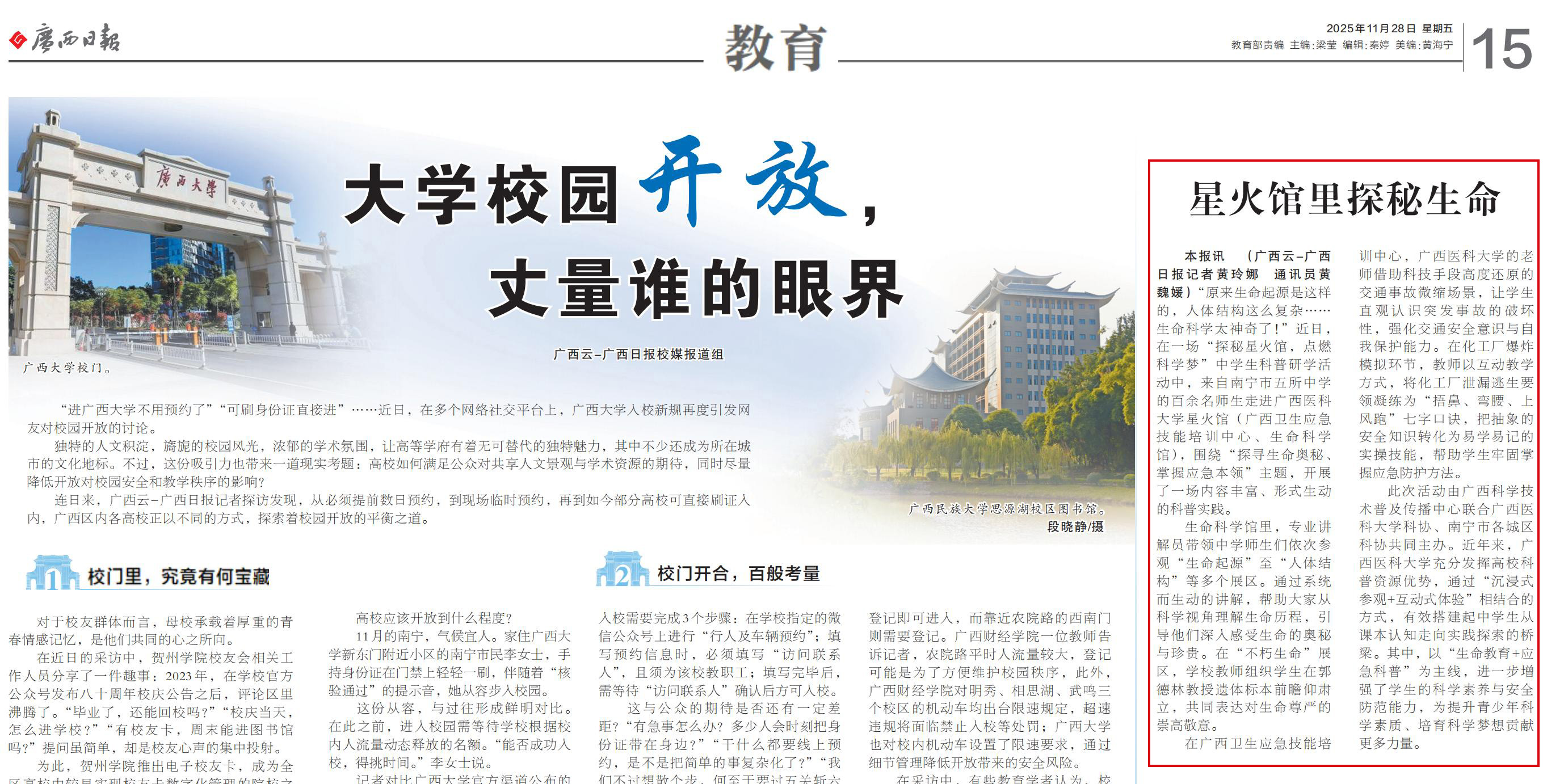 2025年11月28日,广西日报报道来自南宁市五所中学的百余名师生走进beat365在线唯一官网星火馆(广西卫生应急技能培训中心、生命科学馆),围绕“探寻生命奥秘、掌握应急本领”主题,开展了一场内容丰富、形式生动的科普实践。
