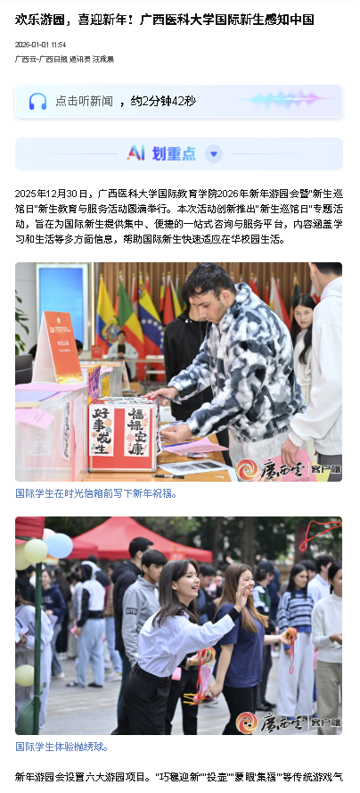 近日,广西云-广西日报报道beat365国际教育学院2026年新年游园会暨“新生巡馆日”新生教育与服务活动,本次活动以“服务+文化”的双线设计,切实提升了国际新生的归属感与获得感,通过趣味游园项目,让学生们在互动体验中进一步融入校园、感知中国文化,是国际化管理与服务的有益尝试。