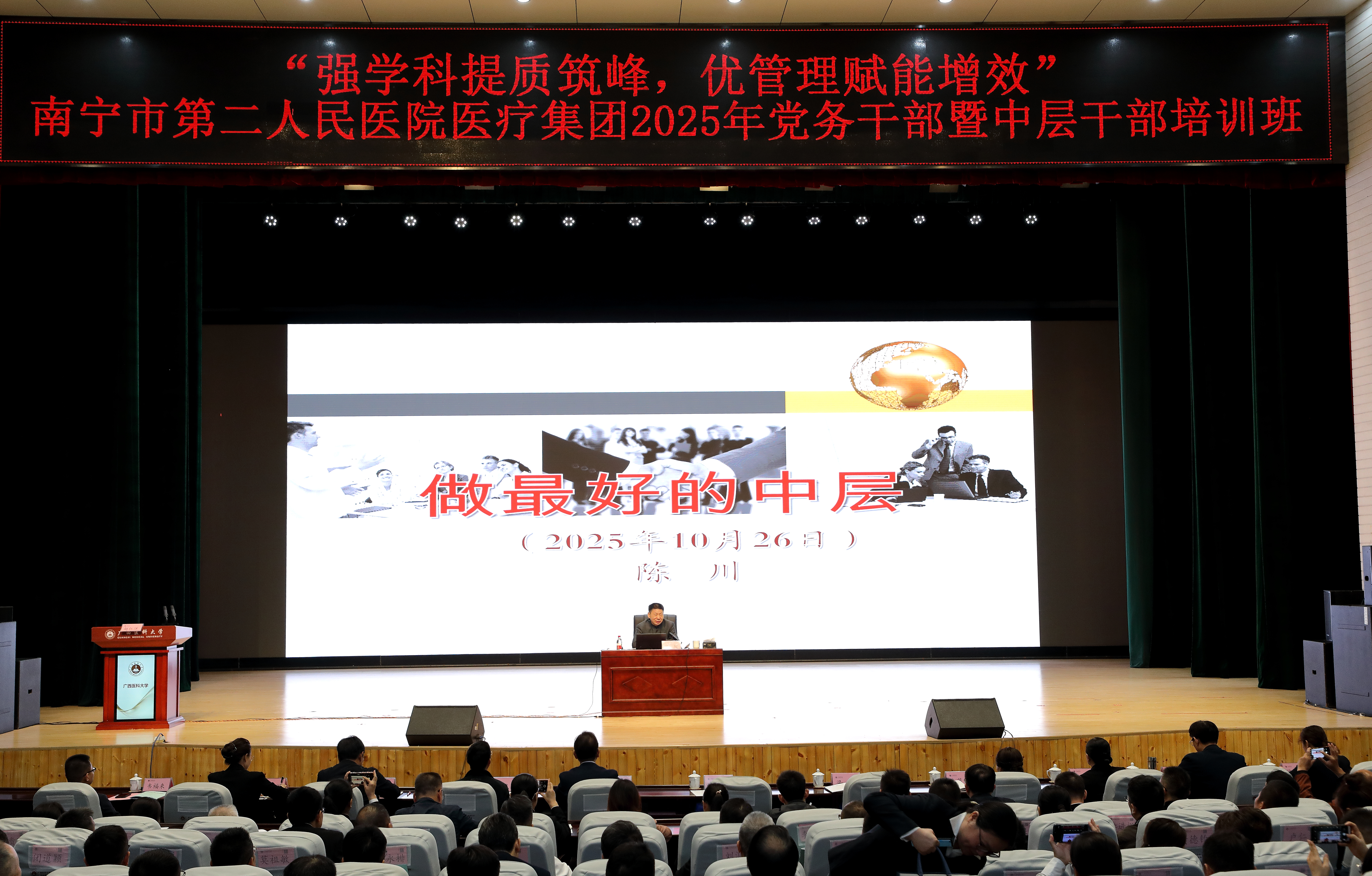 10月26日,校党委书记陈川应邀为南宁市第二人民医院医疗集团600余名党务干部作题为《做最好的中层》专题授课。