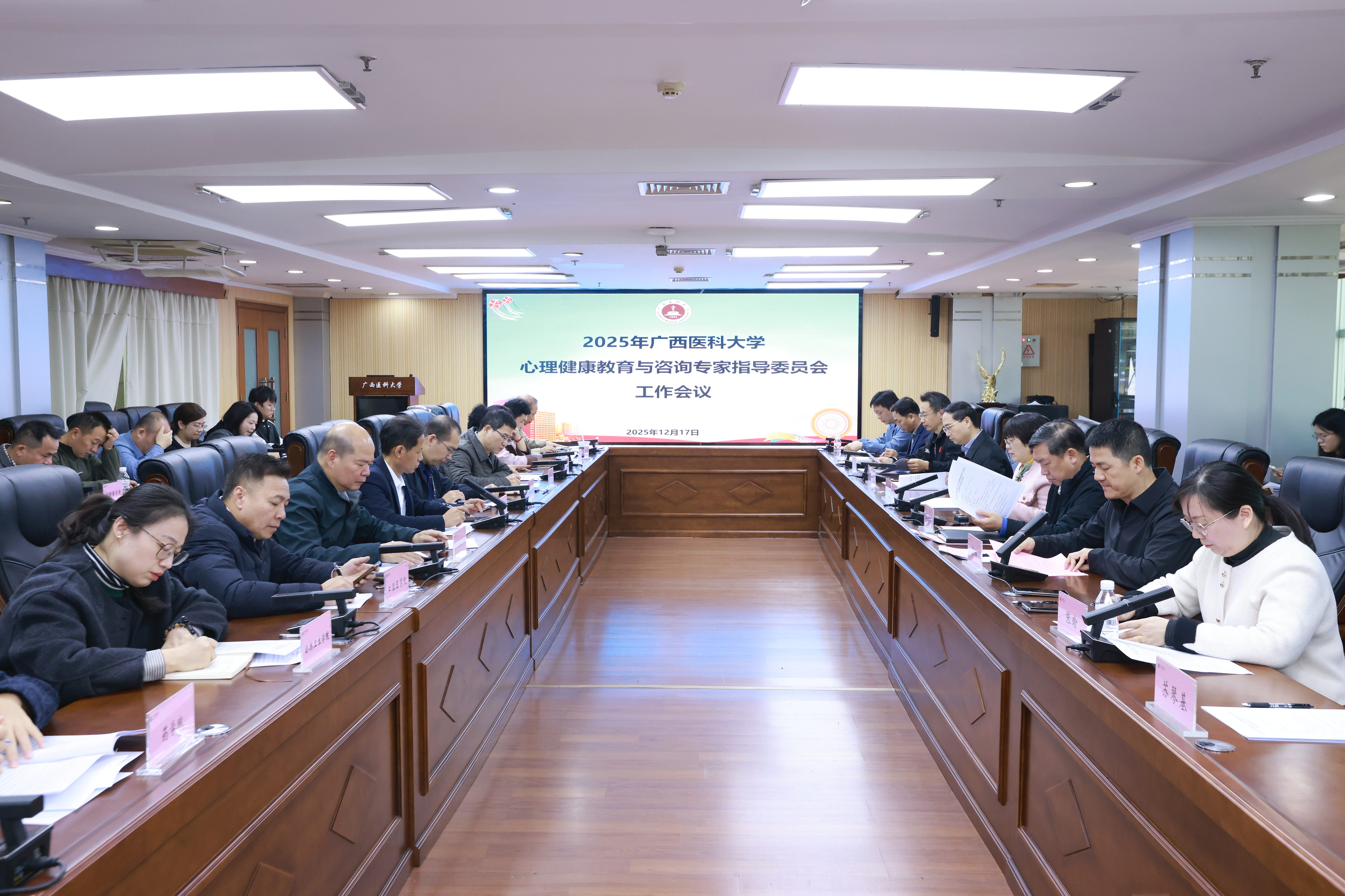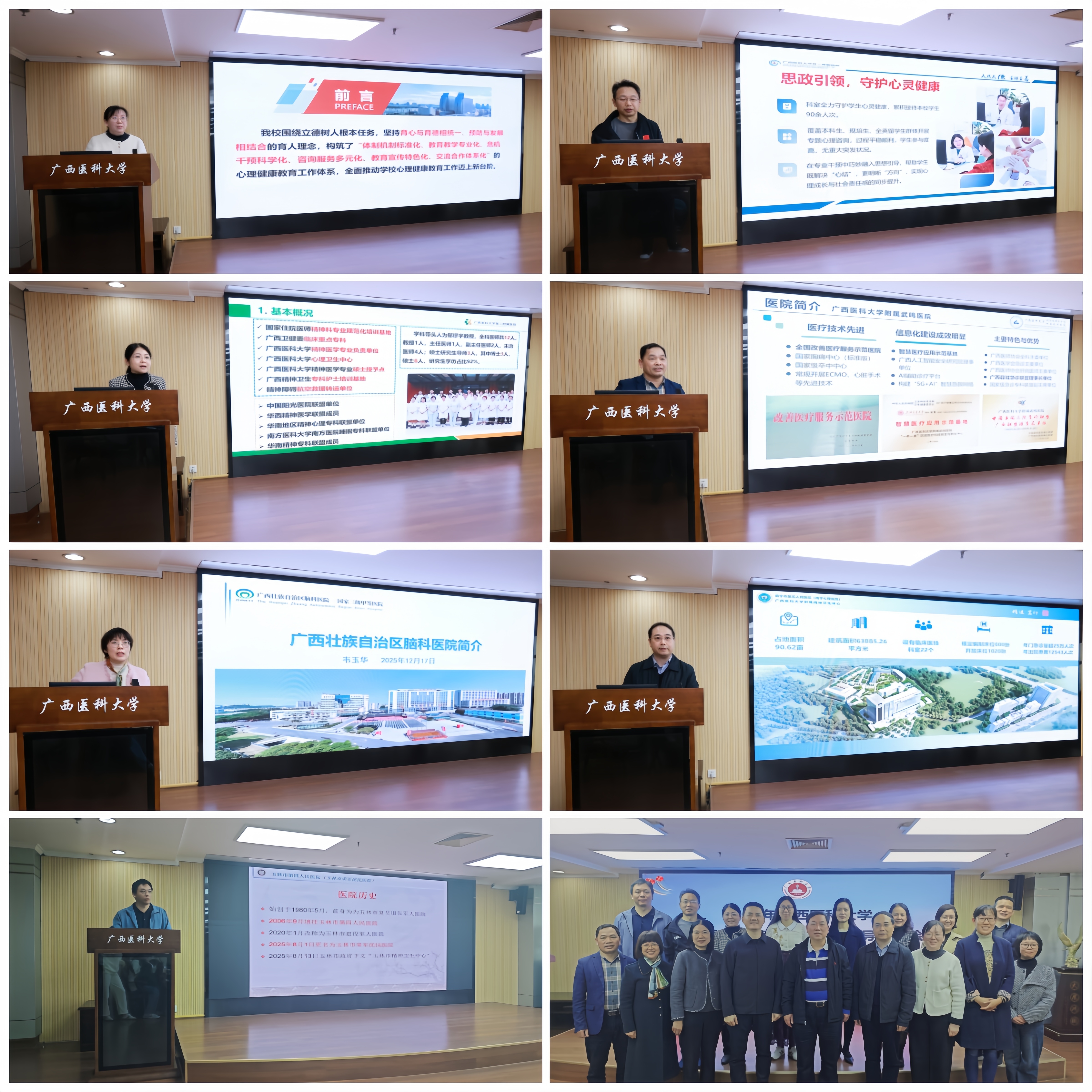 第一附属医院、第二附属医院、附属武鸣医院、附属精神卫生中心(广西壮族自治区脑科医院)、附属精神卫生中心(南宁市第五人民医院)、玉林市第四人民医院的校内外精神卫生专家,各校区心理中心负责人及各学院分管学生工作领导、心理工作联络员共70余人参加会议。