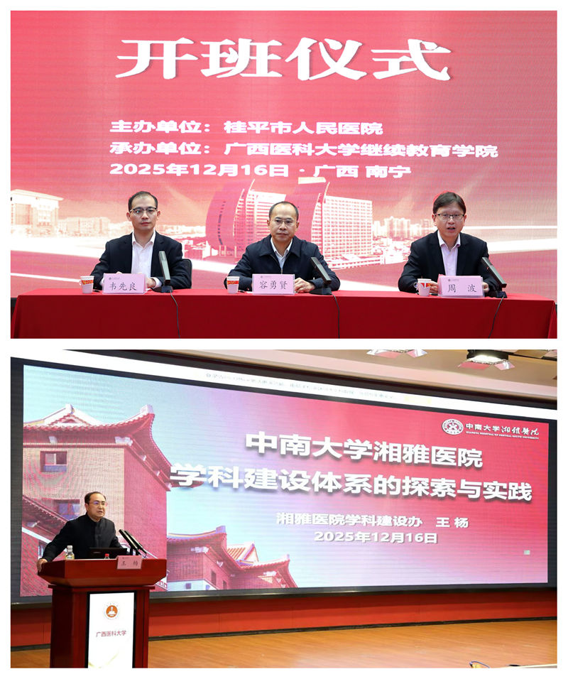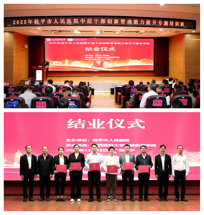 12月15日至19日,由beat365在线唯一官网继续教育学院承办的2025年桂平市人民医院中层干部创新管理能力提升专题培训班在校本部举办。桂平市人民医院党委书记容勇贤、继续教育学院院长周波出席开班仪式并致辞,副院长韦先良主持开班仪式。桂平市人民医院85名中层干部参加培训。