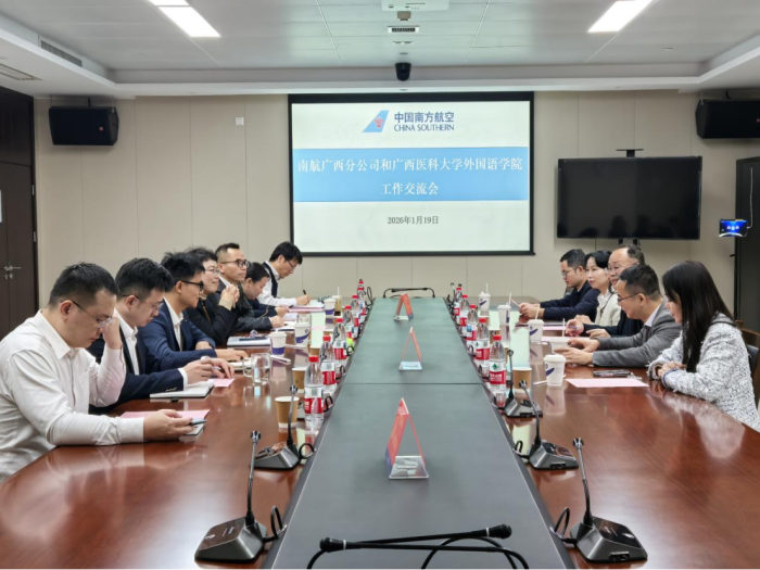 在随后的座谈会上,南航广西分公司市场销售部经理蒋志明介绍南航业务及智慧航空服务等领域创新举措。韦建辉介绍了外国语学院人才培养特色、学生专业与规模、实习就业等情况。
