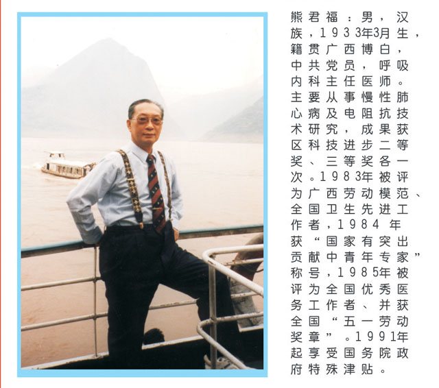 熊君福,男,汉族,1933年3月出生,广西博白县人。1984年7月参加中国共产党。主任医师。第六届全国人民代表大会代表。全区教育系统先进工作者。广西劳动模范。全国卫生先进工作者。全国有突出贡献的中青年专家。全国优秀医务工作者与全国“五一”劳动奖章获得者。