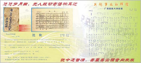 校园洒满阳光,同学意气飞扬,相识美丽邕江,畅游知识海洋,老师教导牢记心上,宝剑常磨闪露锋芒!中华医学后继有人,今天学子明天栋梁。