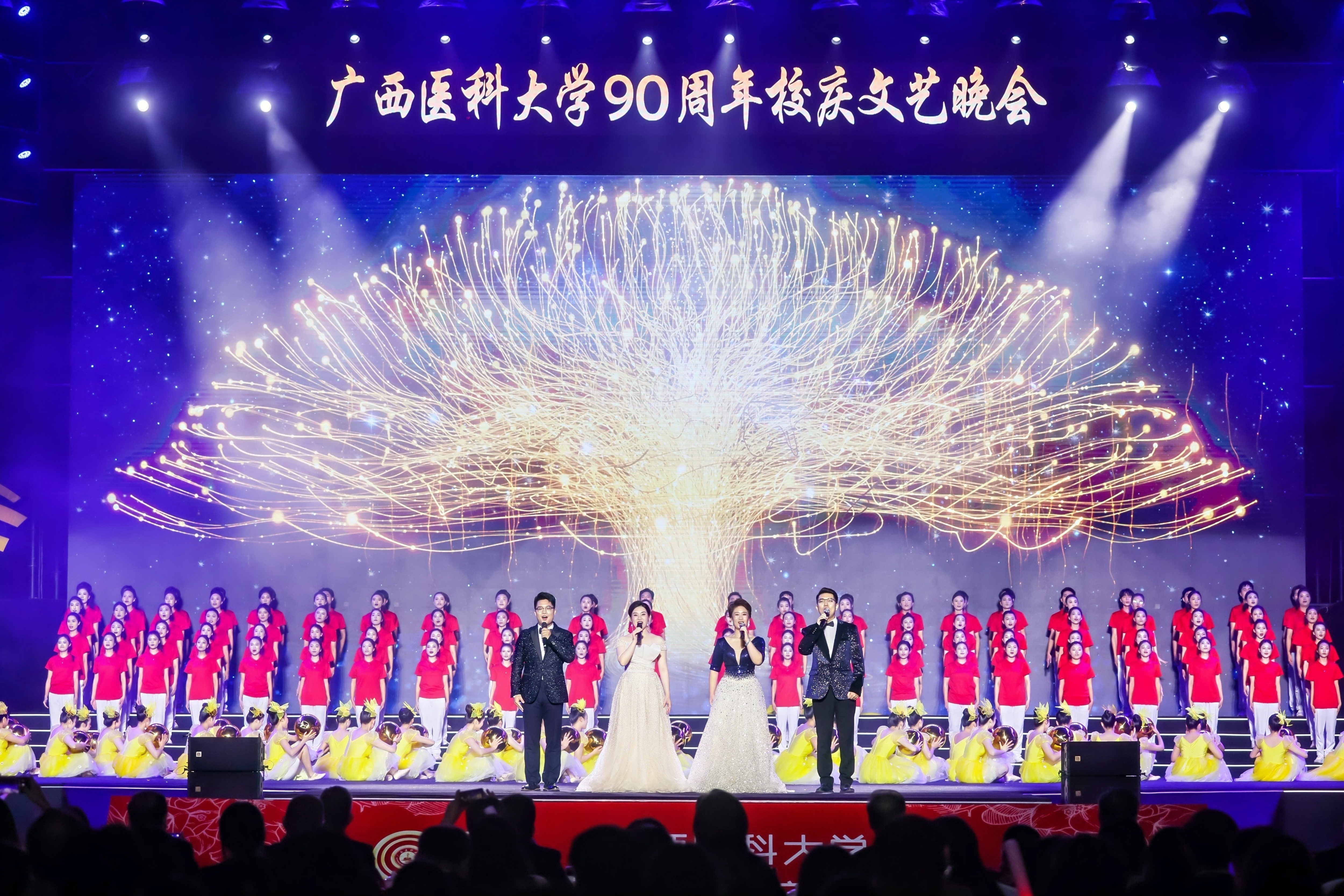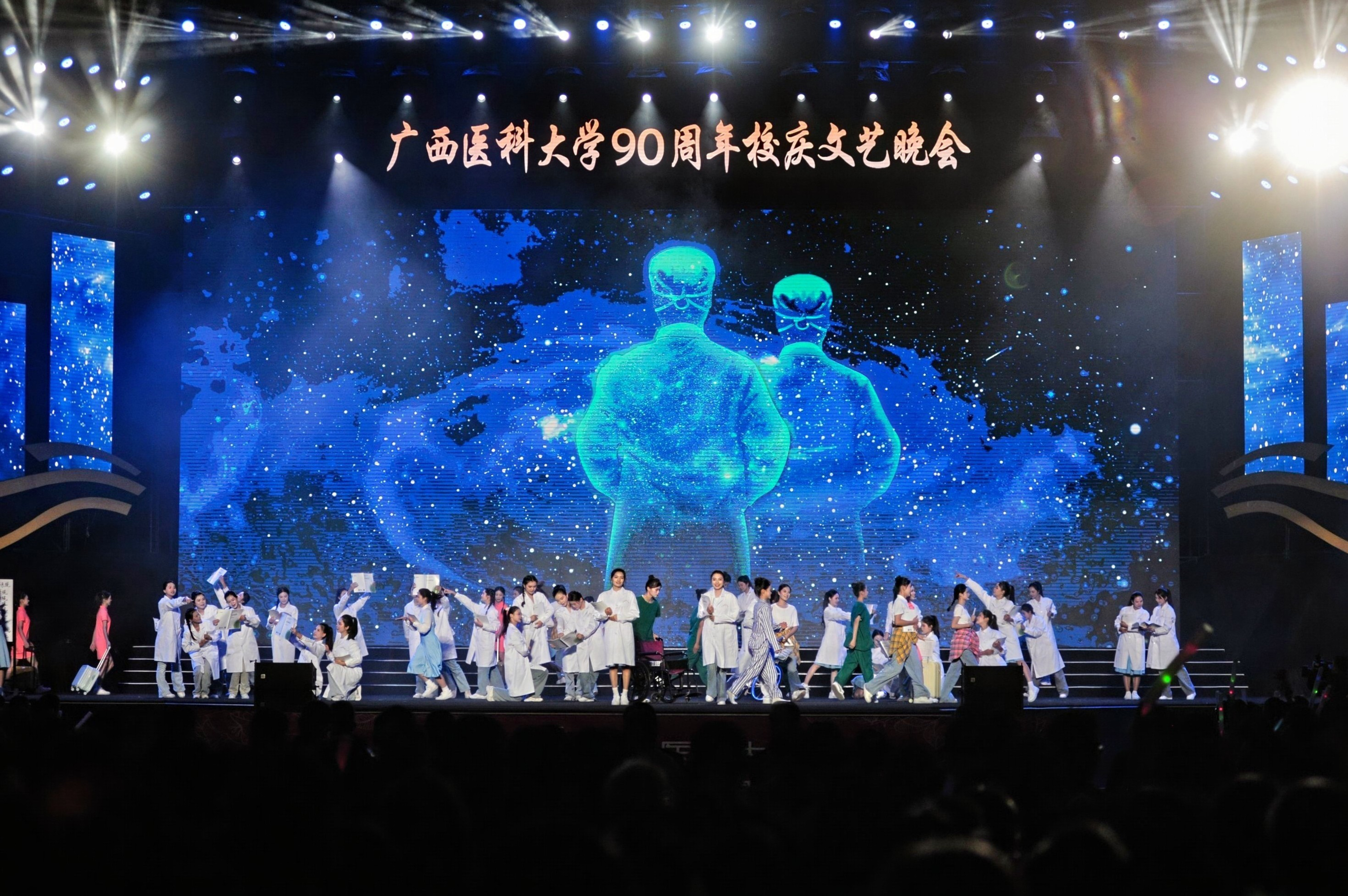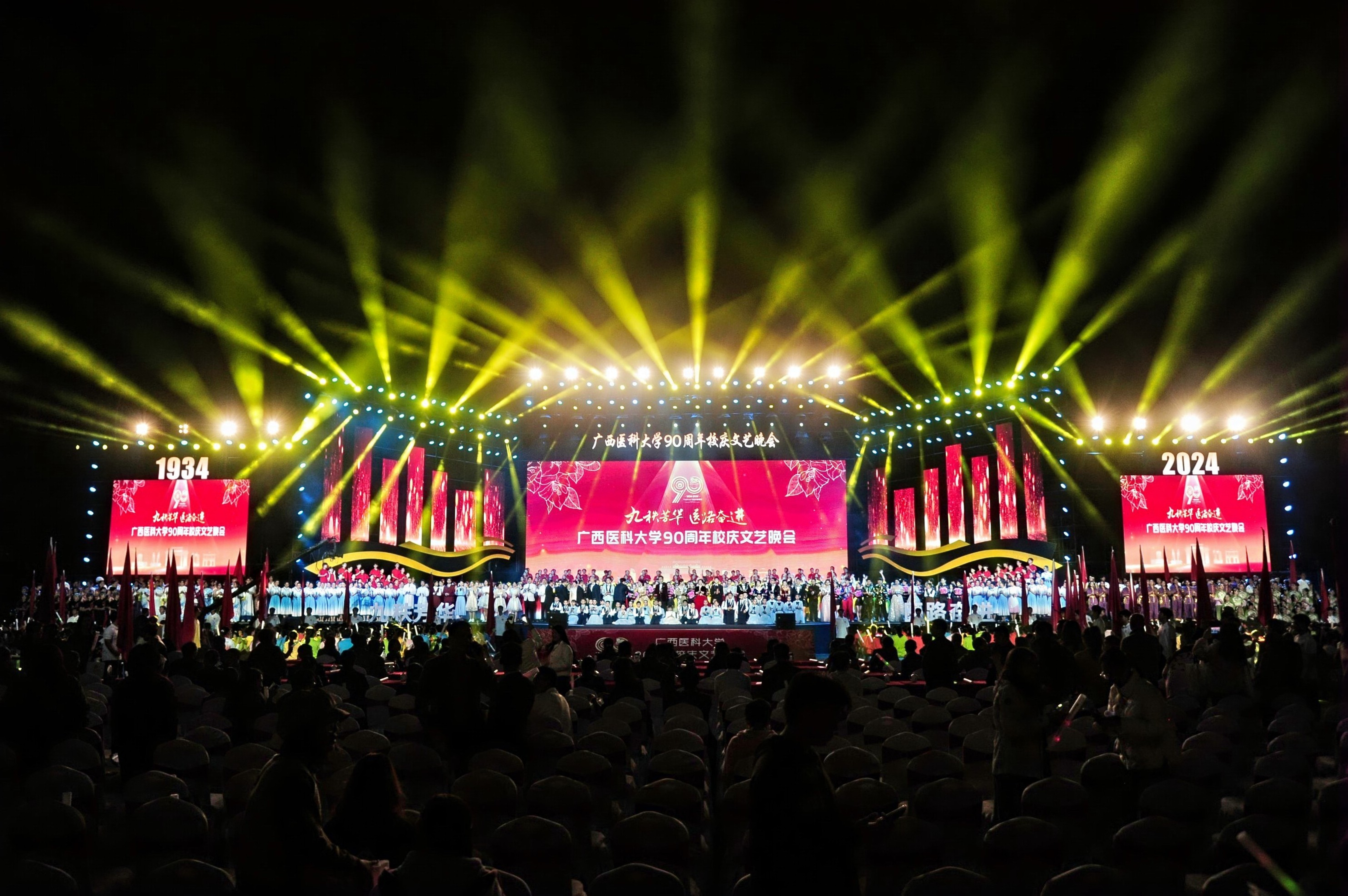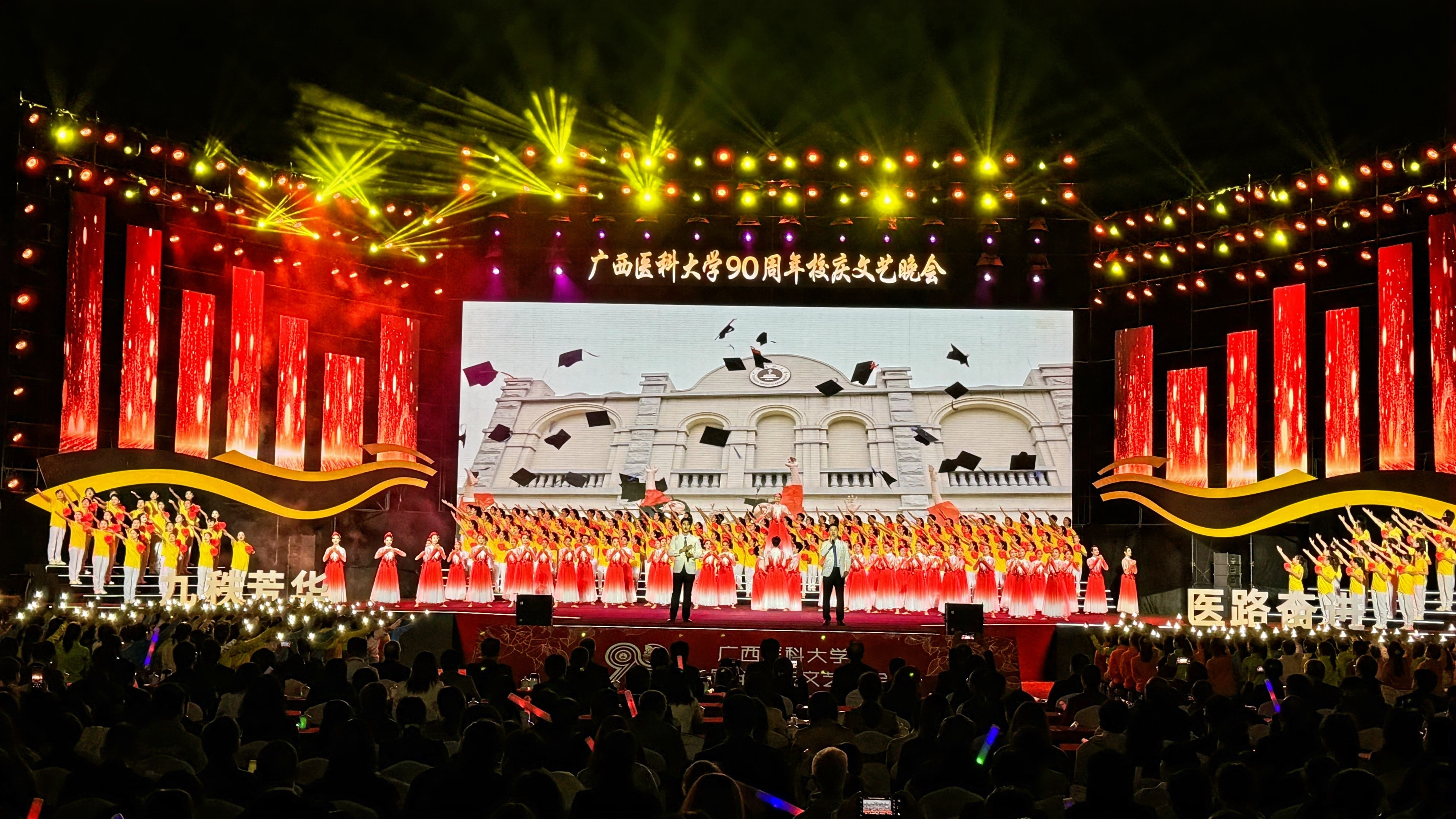 11月21日晚,“九秩芳华 医路奋进”beat365在线唯一官网90周年校庆文艺晚会在南宁-武鸣校区田径场举行。学校校领导出席晚会,学校处级干部、教职工代表、附属医院职工代表、离退休职工代表、各学院学生代表7200余人现场观看晚会。广西广播电视台、广西日报、南国早报、广西云等平台全球同步直播。全校师生员工、海内外校友和关心学校发展的各界人士在现场和云端共庆beat365在线唯一官网九秩华诞。