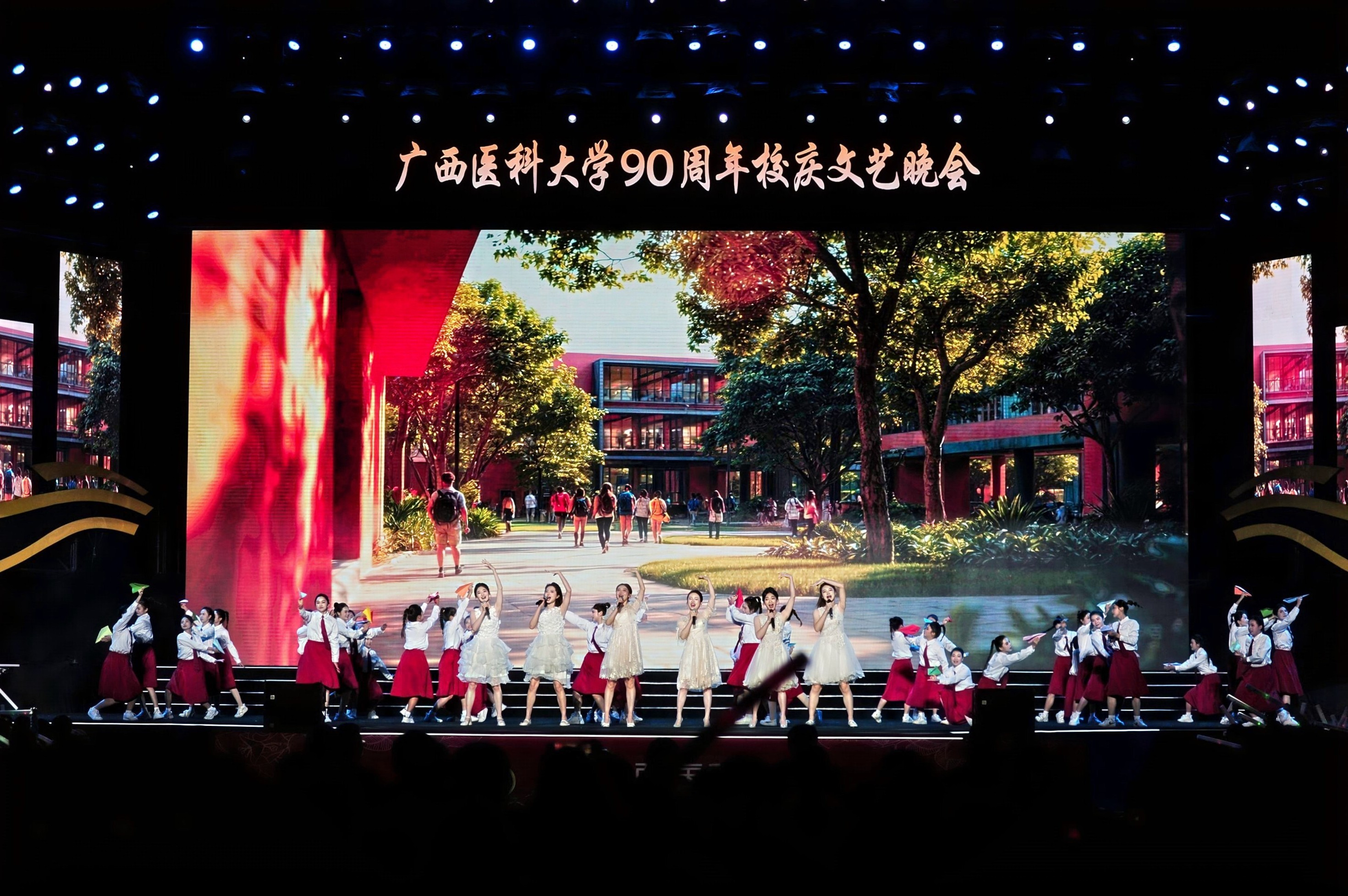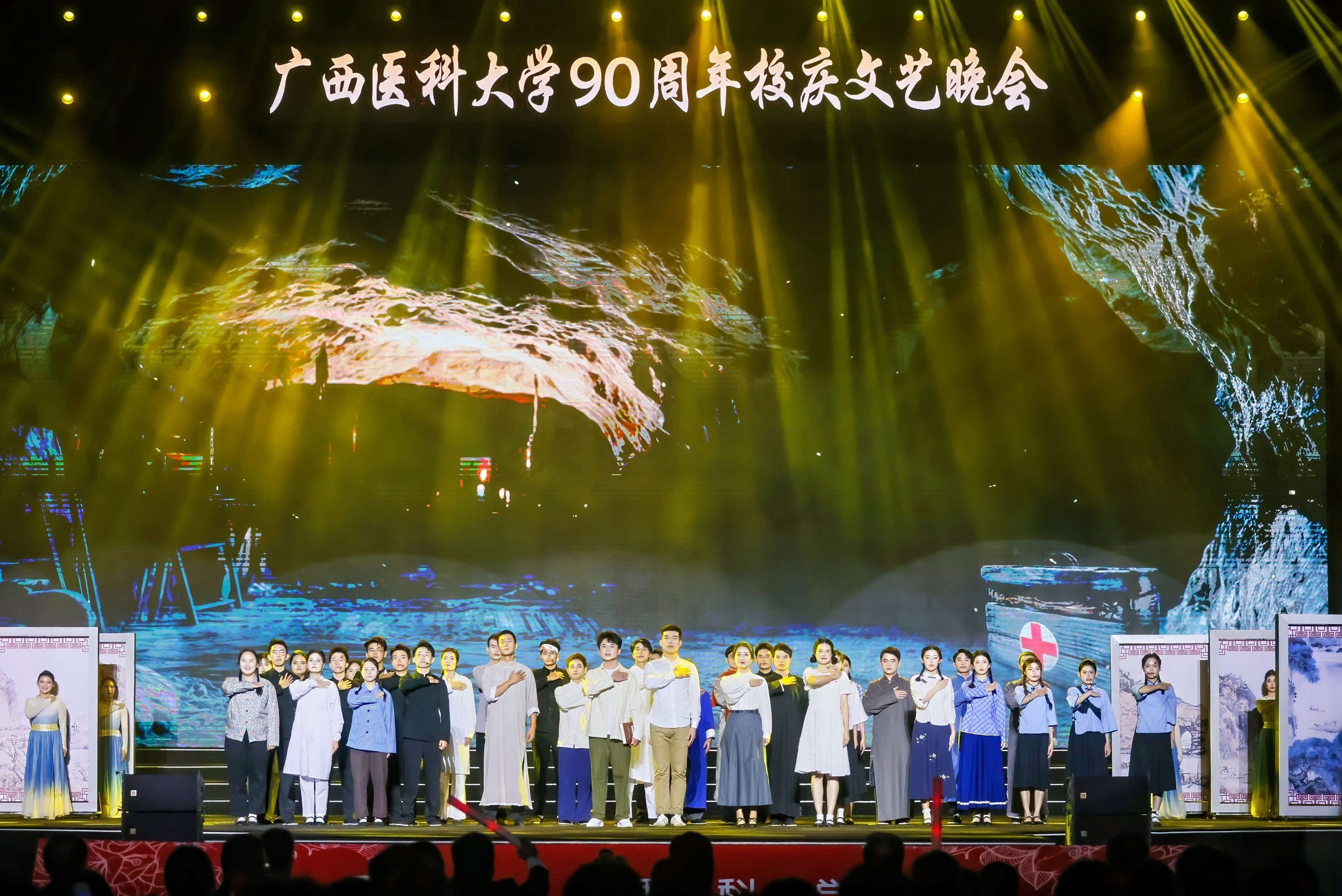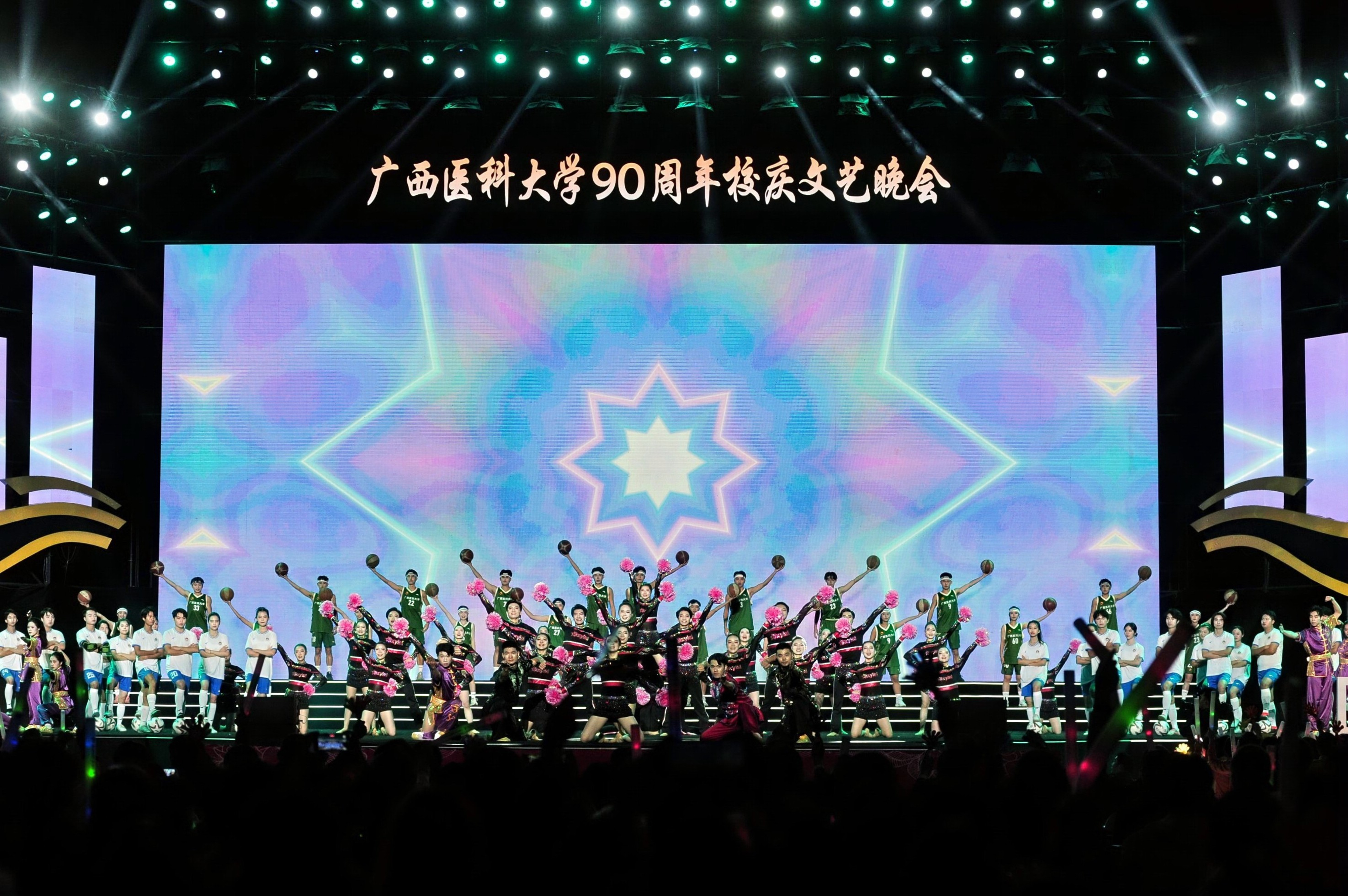 11月21日晚,“九秩芳华 医路奋进”beat365在线唯一官网90周年校庆文艺晚会在南宁-武鸣校区田径场举行。学校校领导出席晚会,学校处级干部、教职工代表、附属医院职工代表、离退休职工代表、各学院学生代表7200余人现场观看晚会。广西广播电视台、广西日报、南国早报、广西云等平台全球同步直播。全校师生员工、海内外校友和关心学校发展的各界人士在现场和云端共庆beat365在线唯一官网九秩华诞。