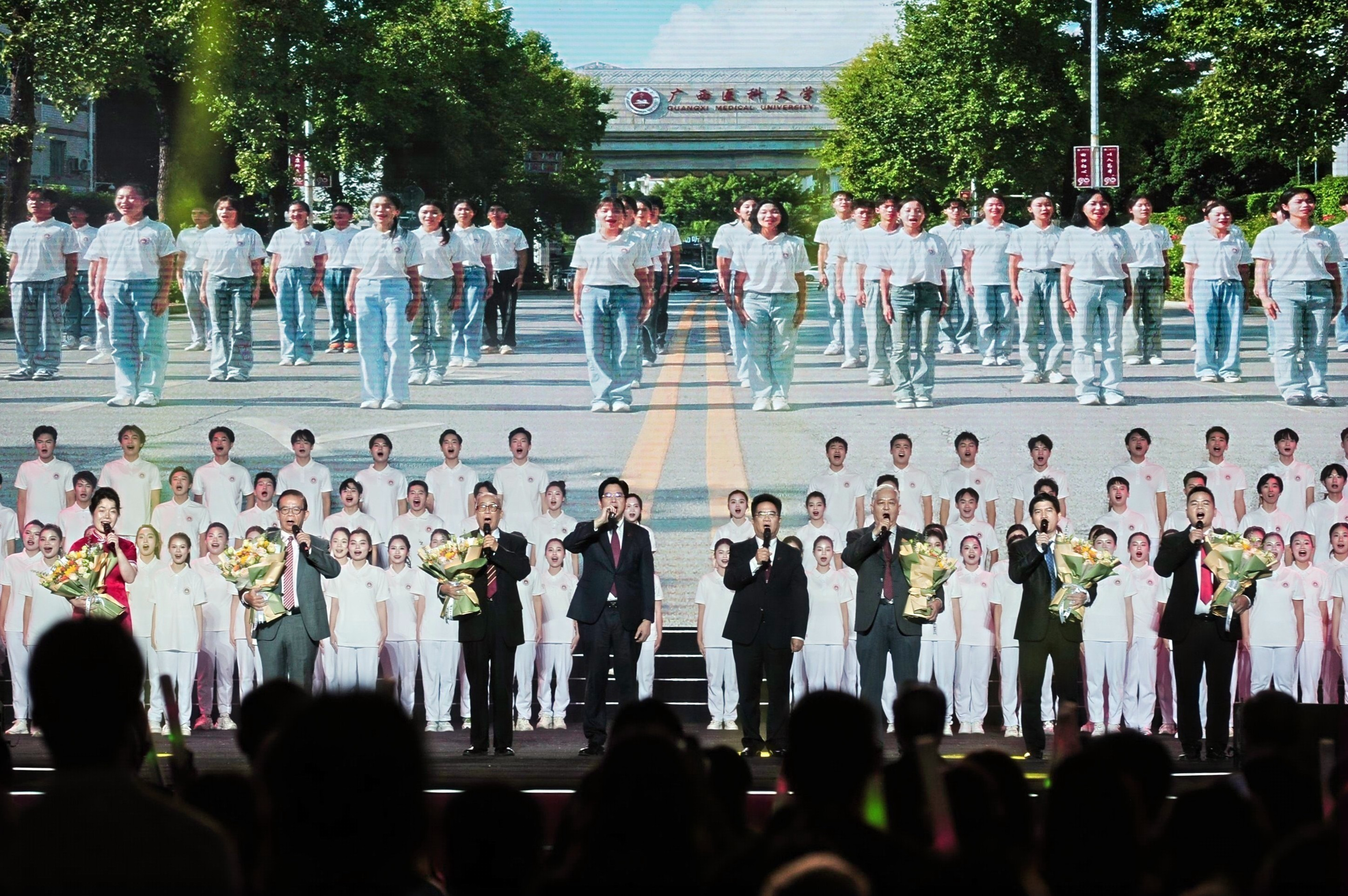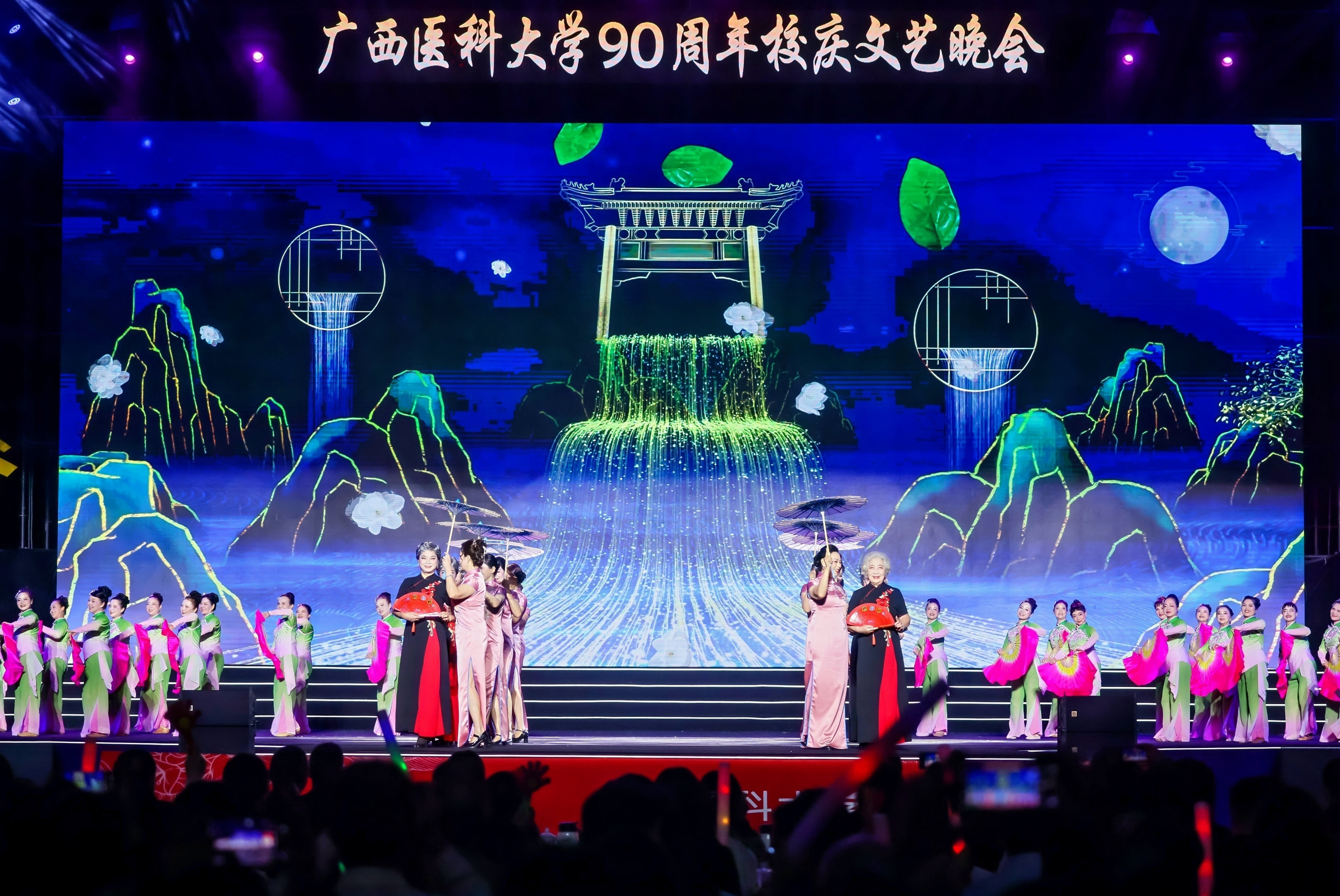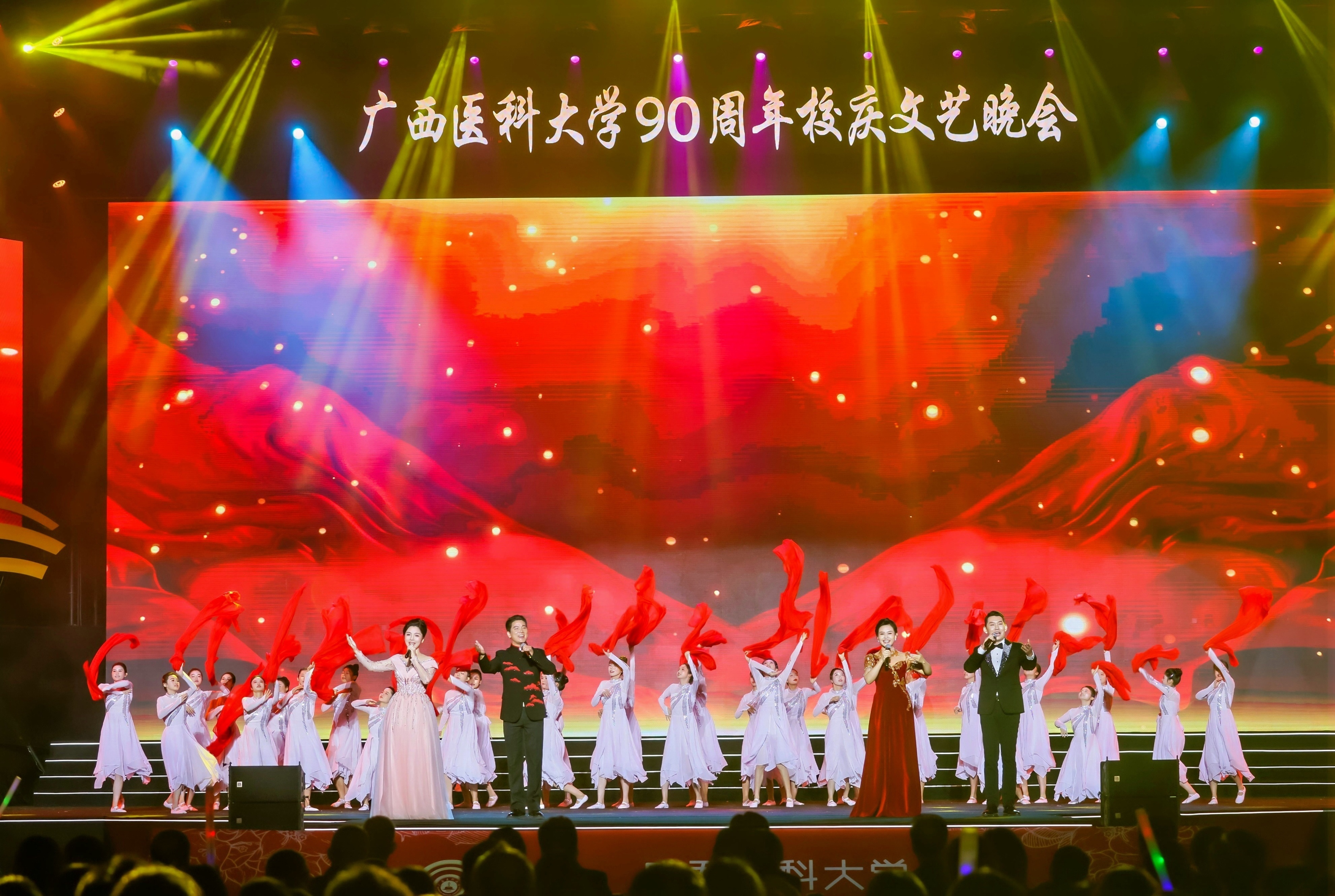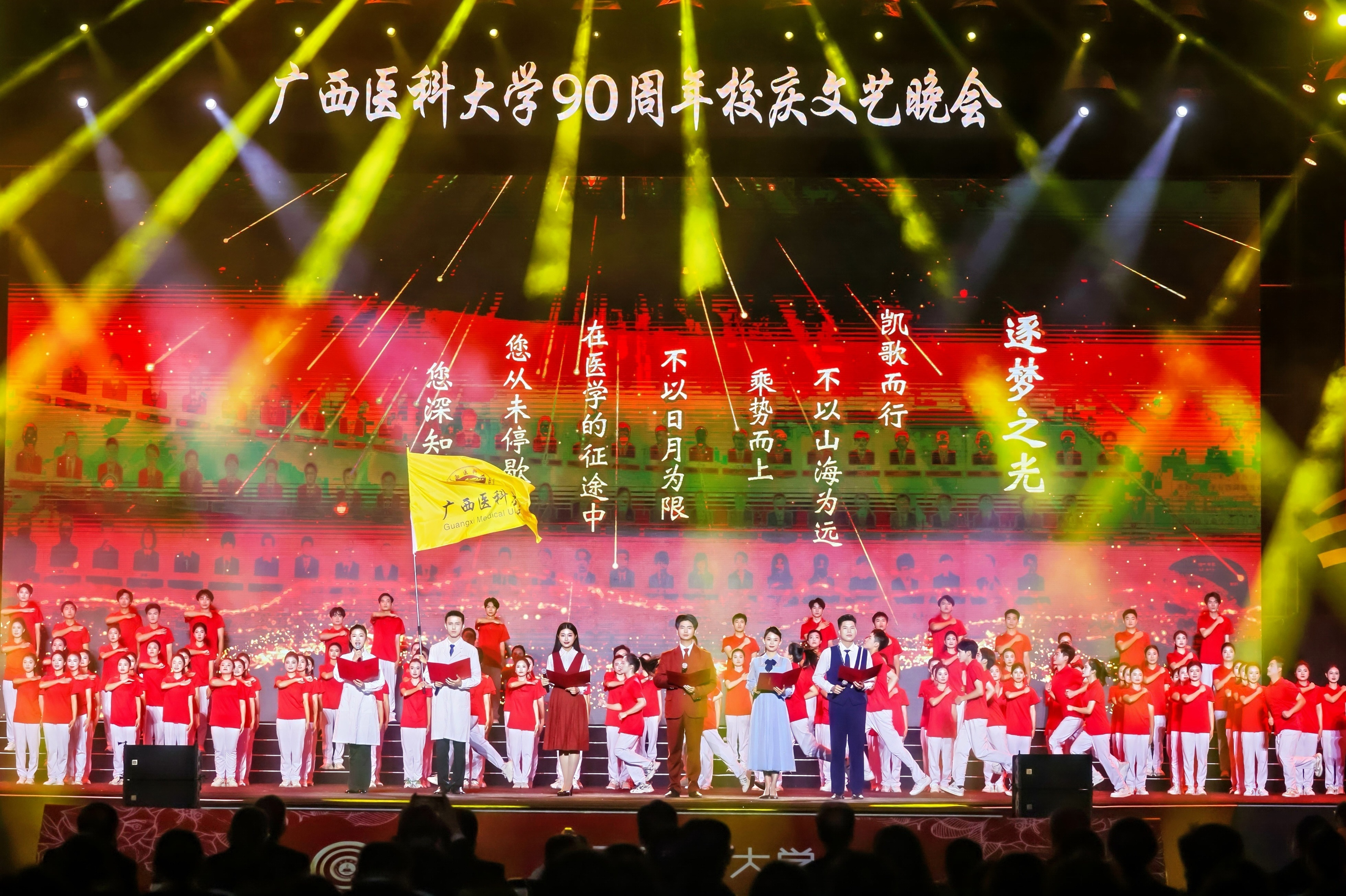 11月21日晚,“九秩芳华 医路奋进”beat365在线唯一官网90周年校庆文艺晚会在南宁-武鸣校区田径场举行。学校校领导出席晚会,学校处级干部、教职工代表、附属医院职工代表、离退休职工代表、各学院学生代表7200余人现场观看晚会。广西广播电视台、广西日报、南国早报、广西云等平台全球同步直播。全校师生员工、海内外校友和关心学校发展的各界人士在现场和云端共庆beat365在线唯一官网九秩华诞。