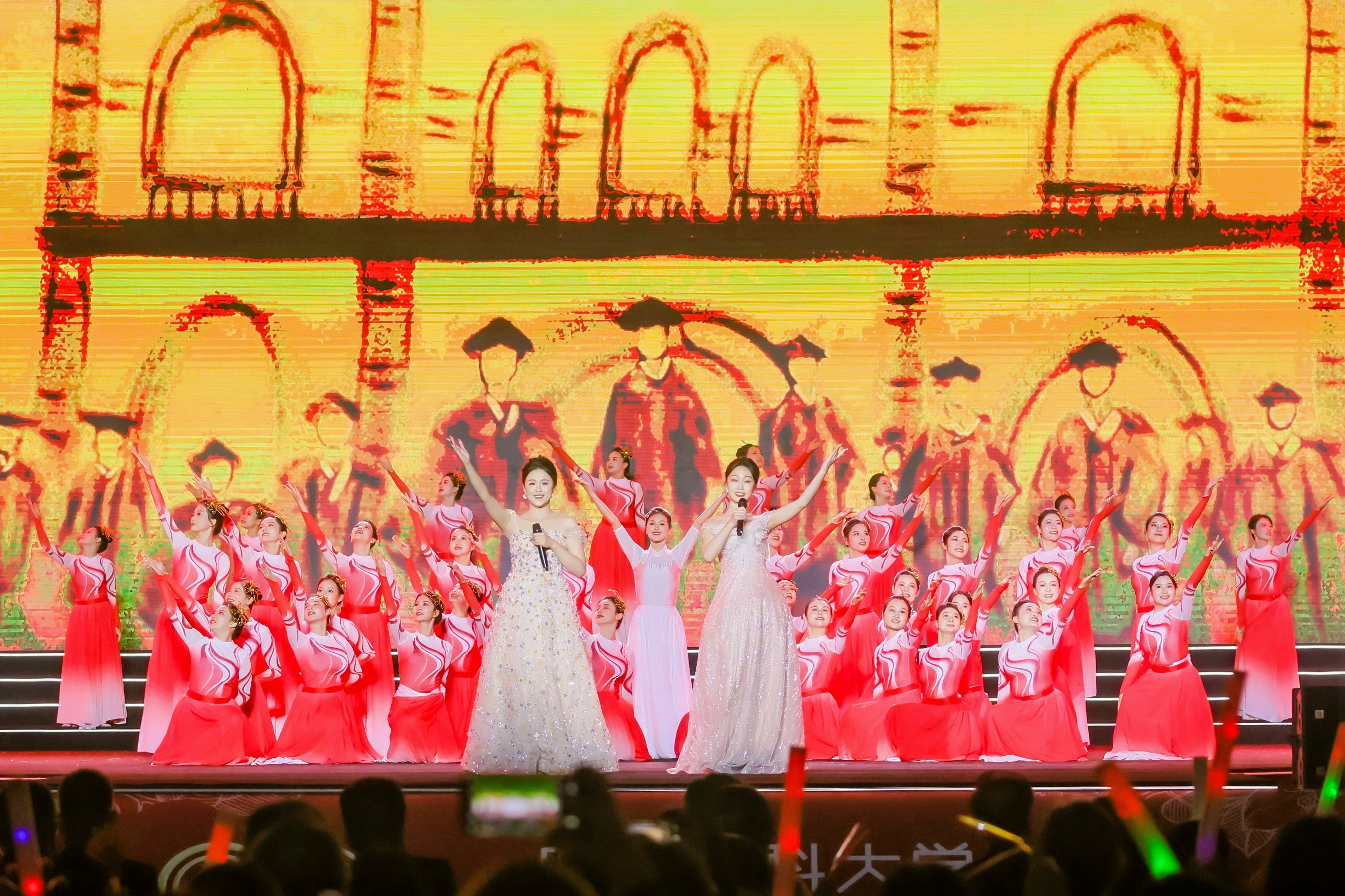 强国之梦,未来之望,第四篇章《昭光奋进》传递了学校在医学教育、科研创新、社会服务等方面的使命与担当,对未来的美好憧憬。舞蹈《守护》展现医大人作为生命和健康的守护者的坚韧与勇气,传递爱与希望的力量。异国风情秀《丝路欢歌》以歌舞传情,留学生们用精彩的节目送上对学校生日的祝福。情景朗诵《使命·前行》带领大家穿越时空的长廊,见证医大人的艰辛探索和坚定信念。“厚德励志、博学弘医,守护生命、无私奉献……”大家共同唱响校庆原创主题曲《那是光 那是暖》,让心中永恒的灯塔照亮前行的道路。光影交错,荧光闪闪;载歌载舞,九秩同欣,晚会在大型歌舞《祖国不会忘记》激昂澎湃的合唱声中落幕。观众们尽情挥舞着手中的荧光棒,掌声、欢笑声连绵不绝,传递着大家对学校生日的祝福。