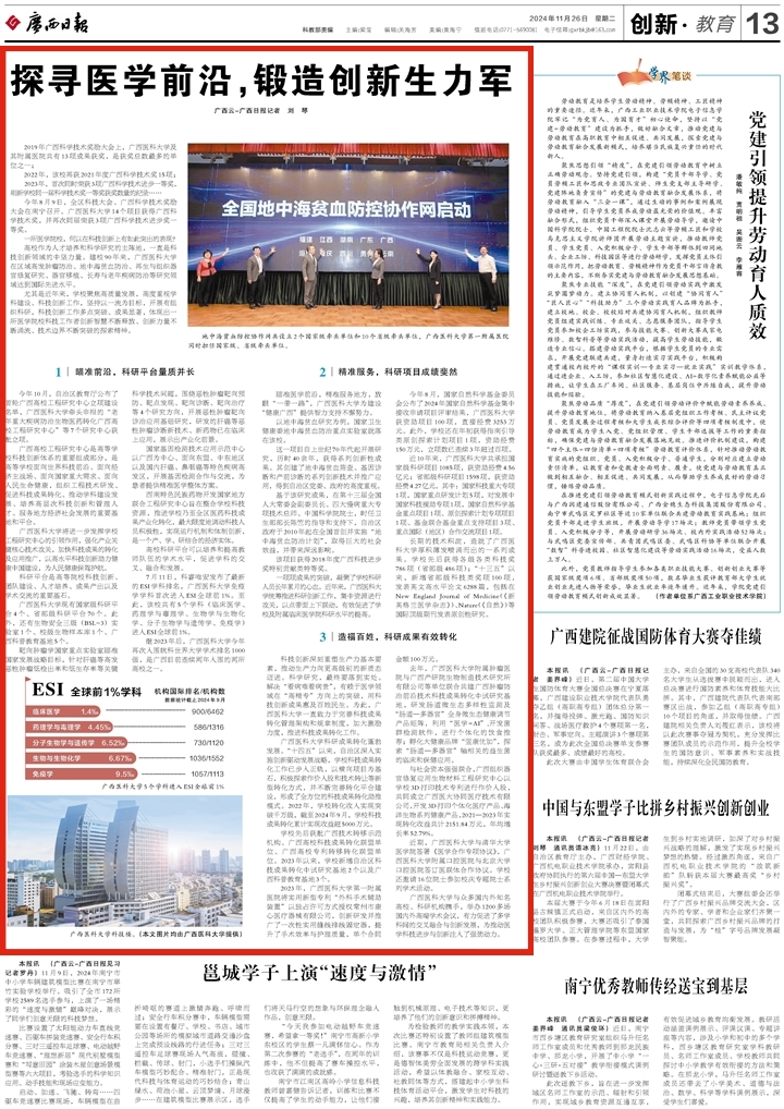 2024年11月26日,《广西日报》在第013版创新·教育专栏刊发题为《探寻医学前沿,锻造创新生力军》的文章,展现beat365在线唯一官网聚焦高质量发展,高度重视学科建设、科技创新工作,坚持以一流为目标,开展有组织科研,科技创新工作多点突破、成果显著的工作成果。