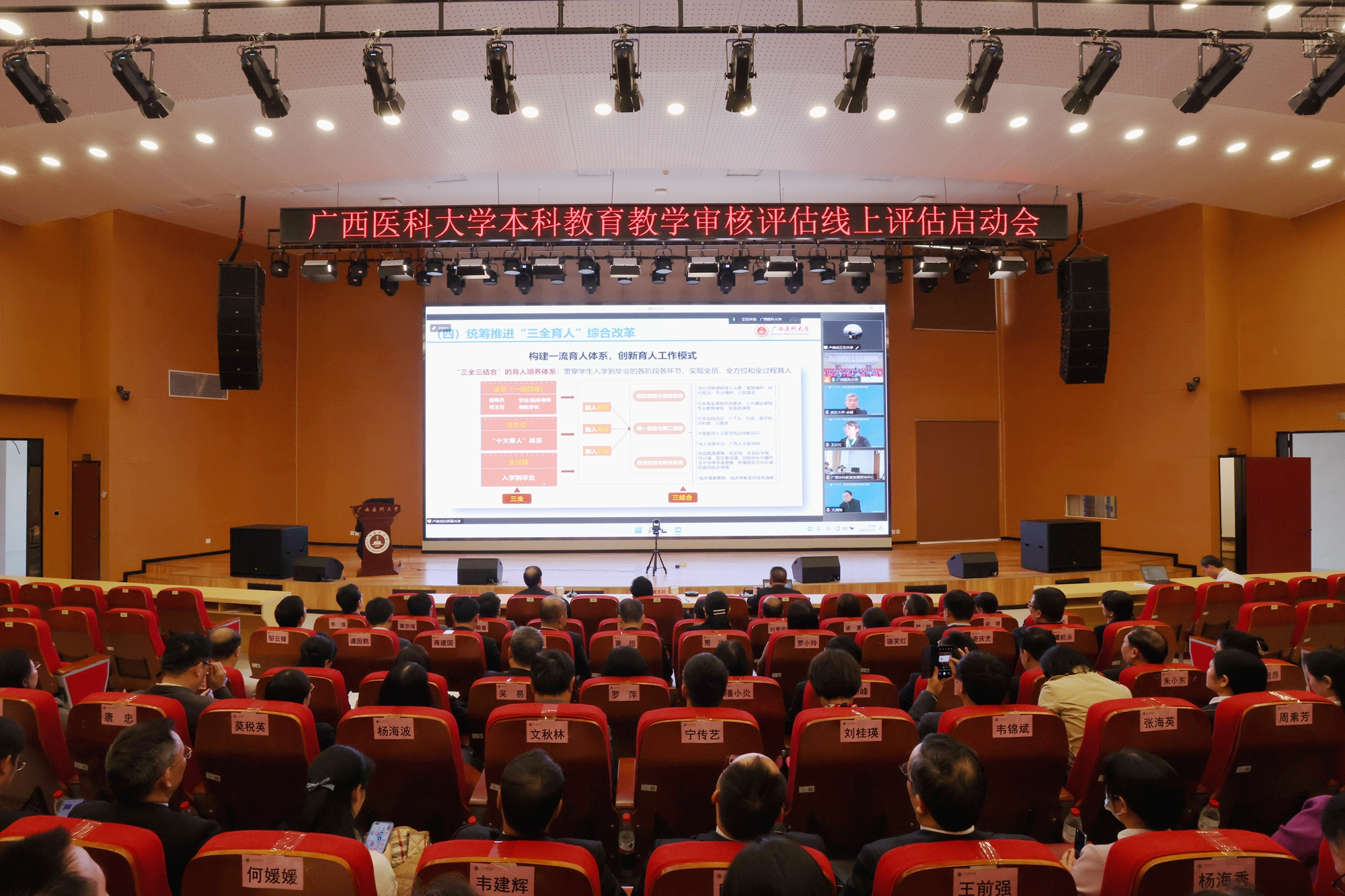 11月17日,beat365在武鸣校区图书馆报告厅设主会场召开本科教育教学审核评估线上评估启动会。自治区教育厅副厅长、一级巡视员黄雄彪,自治区教育厅及广西本科教育发展研究中心相关部门负责人,审核评估专家组组长、南方医科大学原副校长文民刚,审核评估专家组副组长、山东第一医科大学副校长刘传勇教授等17位专家组全体成员,学校党委副书记、校长曾志羽,党委副书记刘灵光,党委常委、副校长卢德成,学校各职能部门主要负责人,各二级学院书记、院长、分管本科教学副院长,学生代表,审核评估评建办公室全体成员参加主会场会议。各二级学院、非直属附属医院组织教职工在分会场参会。会议由卢德成副校长主持。