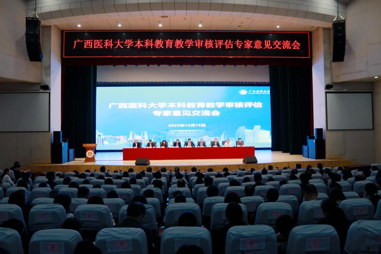 12月15日上午,学校在校本部图书馆演讲厅召开本科教育教学审核评估专家意见交流会。专家组全体成员,自治区教育厅副厅长黄雄彪,高等教育处处长、学位办主任傅源方,广西本科教育发展研究中心办公室主任梁宇等出席会议。学校全体在家校领导,全体中层干部,科级干部、教师和学生代表,审核评估评建办公室全体成员近370余人参加会议。会议由专家组副组长刘传勇教授主持。
