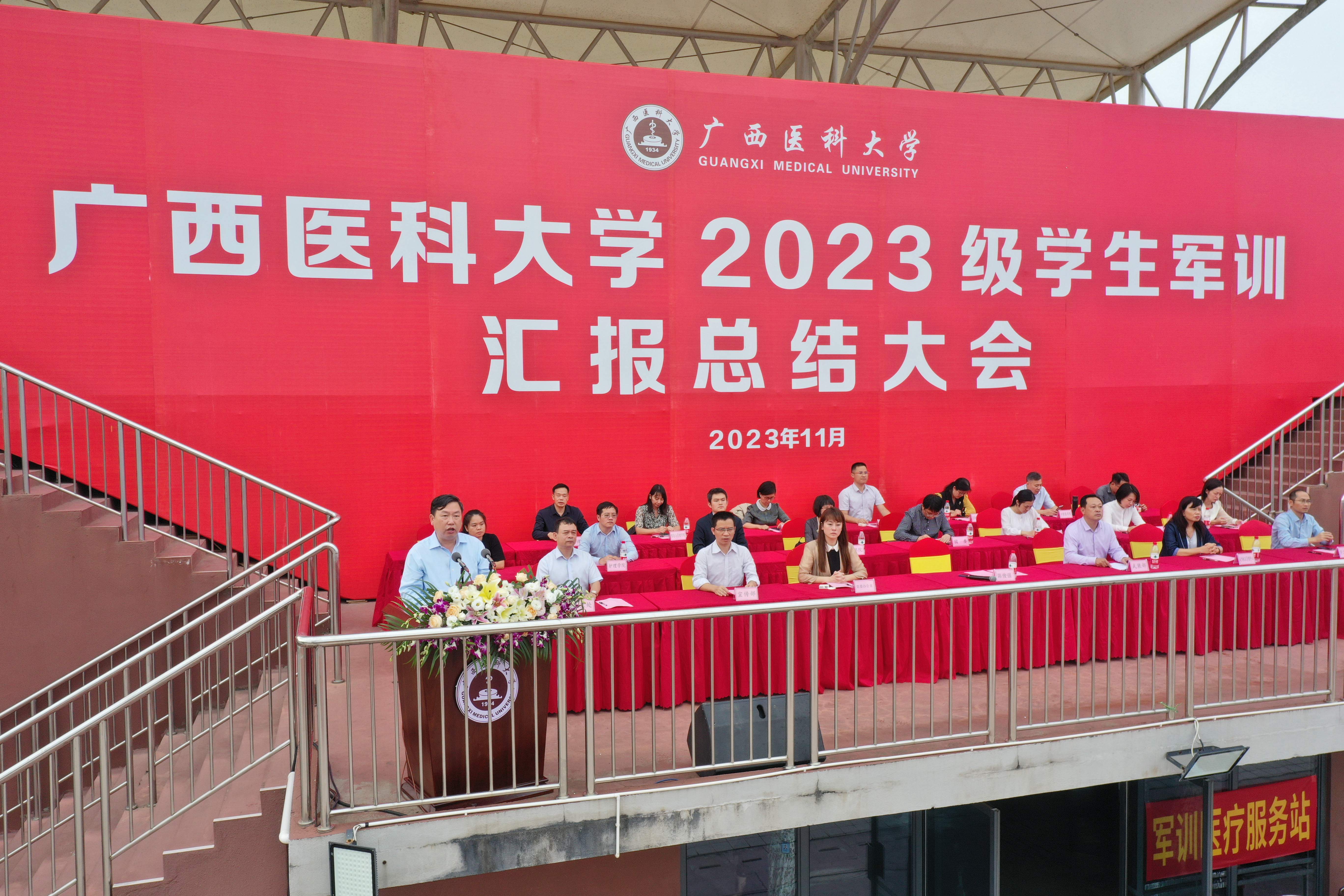 2023年11月9日下午,beat3652023级学生军训汇报总结大会在武鸣校区运动场举行。学校党委常委、副校长陈俊强,学校党(校)办、武装部、宣传部、学工部、团委、教务处、招就处、保卫处、后勤基建处、武鸣管理中心和基础、公卫等二级学院领导出席。会议由学校党委武装部副部长覃益敏主持。