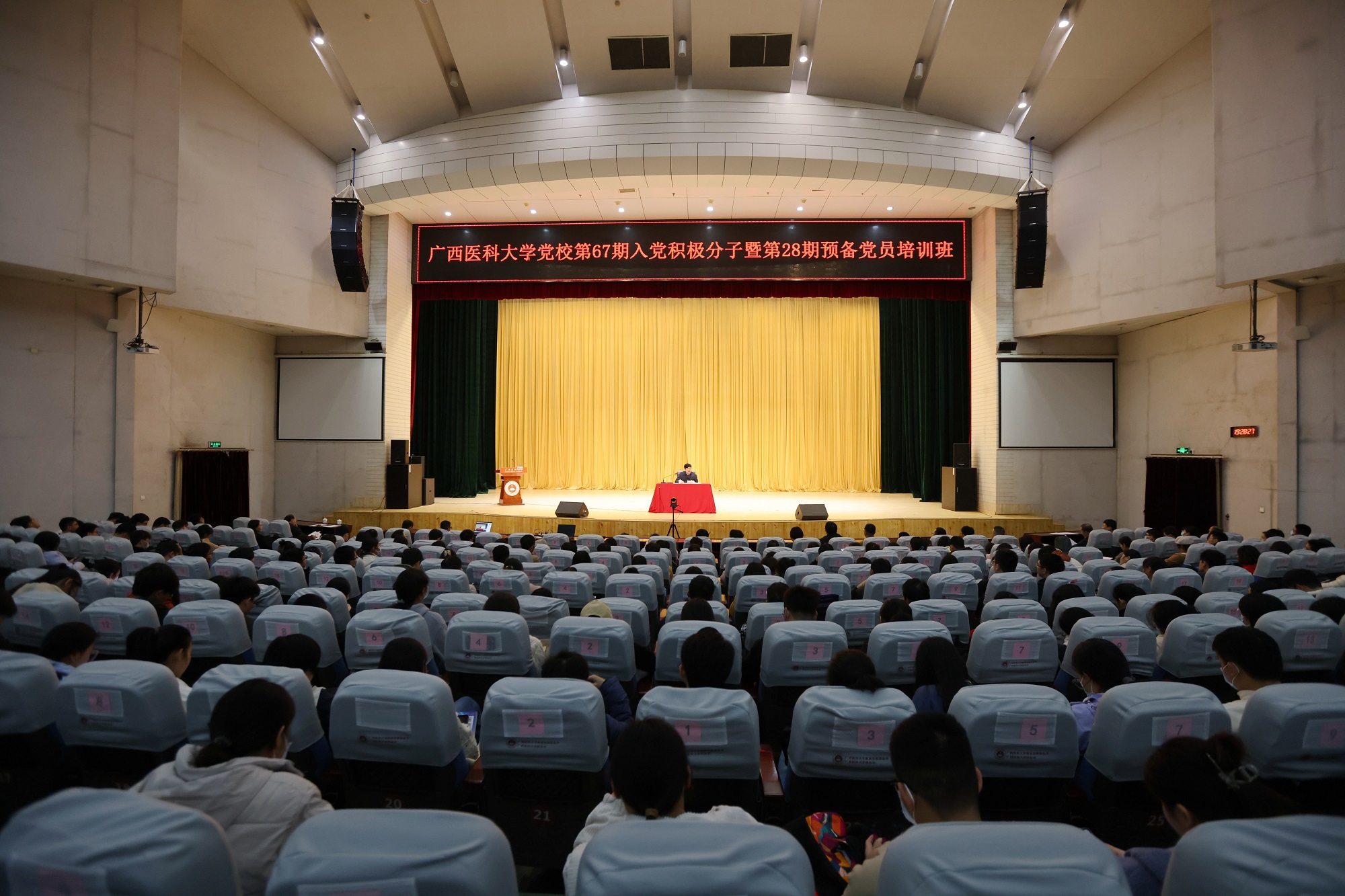 为深入学习贯彻习近平新时代中国特色社会主义思想,12月4日晚,beat365党校第67期入党积极分子暨第28期预备党员培训班专题党课在校本部图书馆演讲厅举行。校党委书记黄照权通过线下讲授和线上直播的形式为1190名入党积极分子、568名预备党员师生上了一堂题为《深入学习贯彻习近平新时代中国特色社会主义思想,开辟马克思主义中国化时代化新境界》的专题党课。开班仪式由校党委组织部部长覃远汉主持。