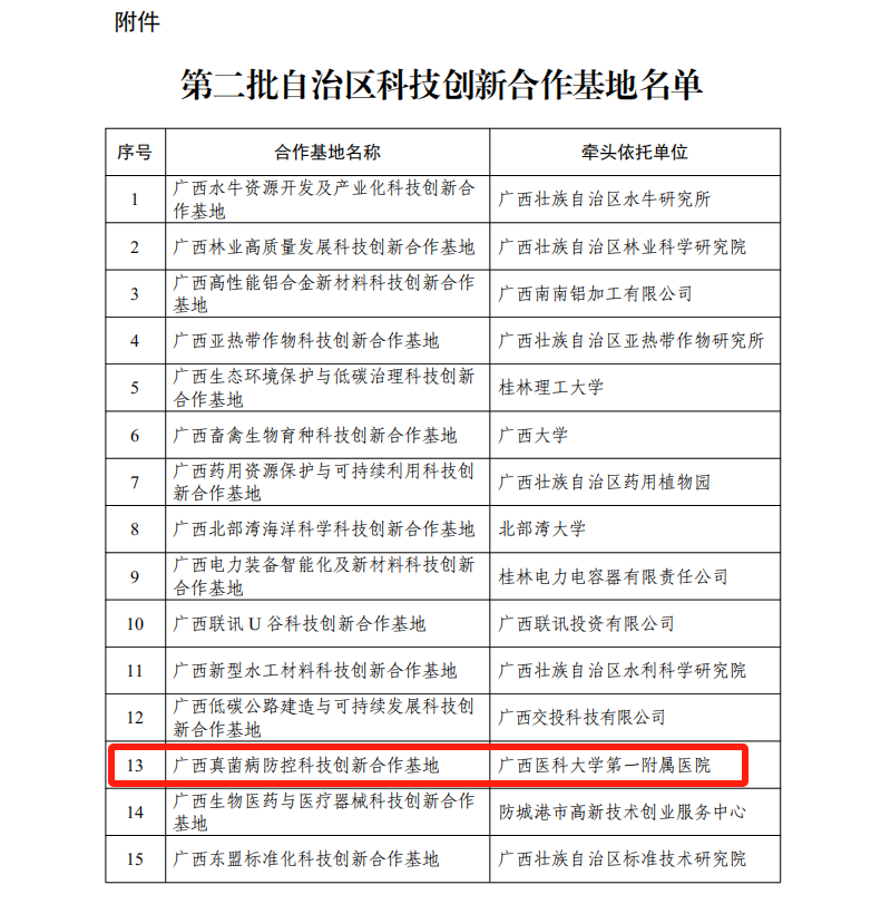 近日,自治区科技厅公布了第二批自治区科技创新合作基地新认定名单,共15家单位入选,其中beat365第一附属医院牵头申报的“广西真菌病防控科技创新合作基地”,榜上有名。
