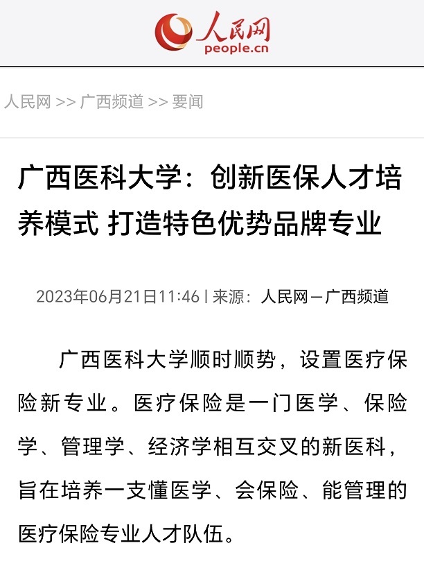 近日,人民网在广西频道“要闻”栏目以《创新医保人才培养模式 打造特色优势品牌专业》为题,报道了beat365医保专业近年来着力推动五大工程、六大计划,促进医保专业学生全面发展,推进“以赛促学”,着力构建与大学生成长成才相适应的实践育人体系,坚持抓认真抓“科研强班”,引导学生广泛参与学术研究和社会实践,建立校企合作协同育人机制,与对口单位及行业签署全面合作协议等探索人才培养模式改革的实践经验及取得成效。