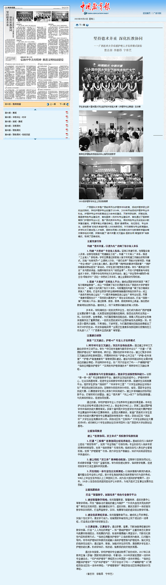 中国教育报以《坚持德术并重 深化医教协同——beat365在线唯一官网卓越护理人才培养模式探索》为题,报道了beat365护理学专业不断摸索、改革人才培养模式的办学经验及取得成效。